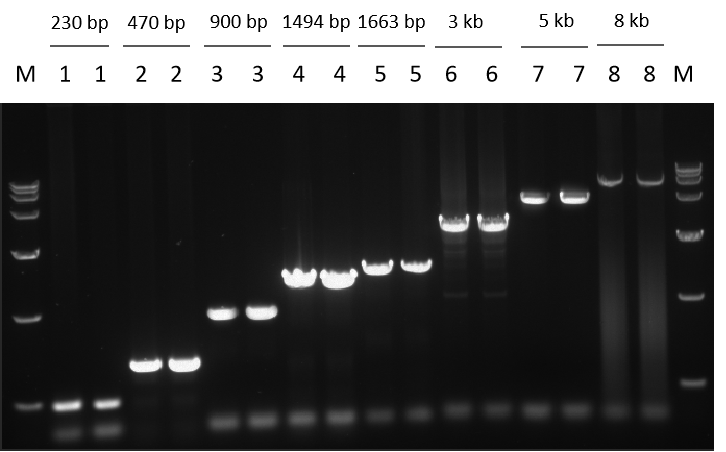 以抗凝劑為 EDTA 的人抗凝血為模板,使用 A161 對(duì)不同長度 DNA 片段進(jìn)行 PCR 擴(kuò)增。電泳檢測結(jié)果顯示,A161 對(duì)不同大小的片段擴(kuò)增能力均較強(qiáng),可以高效擴(kuò)增長達(dá) 8 kb 的片段。
