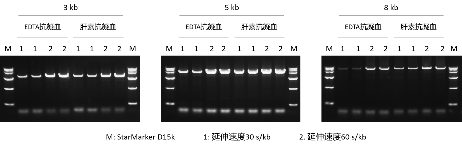 以濃度為 10% 的人全血為模板,使用 A161 進(jìn)行 PCR 擴(kuò)增,延伸時(shí)間分別設(shè)置為 30 s/kb 和 60 s/kb,電泳結(jié)果顯示,延伸時(shí)間為 30 s/kb 即可擴(kuò)增出不同長度的目的條帶,延伸時(shí)間越長,擴(kuò)增產(chǎn)物量越大,當(dāng)擴(kuò)增片段長度 ≥5 kb,建議延伸時(shí)間設(shè)置為 60 s/kb。