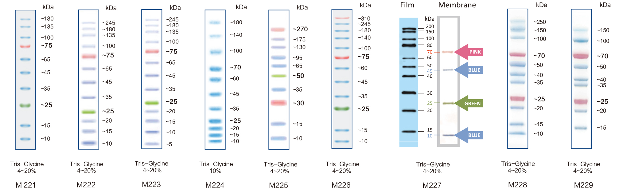 本產(chǎn)品由跨度從 10-180 kDa 的 10 種高度純化預(yù)染的重組蛋白質(zhì)組成,各條帶濃度約為 0.2-0.4 mg/ml。其中 25 kDa 條帶為綠色預(yù)染條帶,75 kDa 條帶為紅色預(yù)染條帶,方便判斷各個(gè)條帶的準(zhǔn)確位置。本產(chǎn)品適合作為 SDS-PAGE 電泳時(shí),變性蛋白樣品的分子量參照,并可實(shí)時(shí)觀察蛋白樣品的電泳分離狀況,也可用于檢測(cè) Western blot 的轉(zhuǎn)膜效率。由于共價(jià)結(jié)合的染料會(huì)影響蛋白質(zhì)分子的電泳遷移率,本產(chǎn)品僅適于粗略地估計(jì)目的蛋白樣品的分子量。