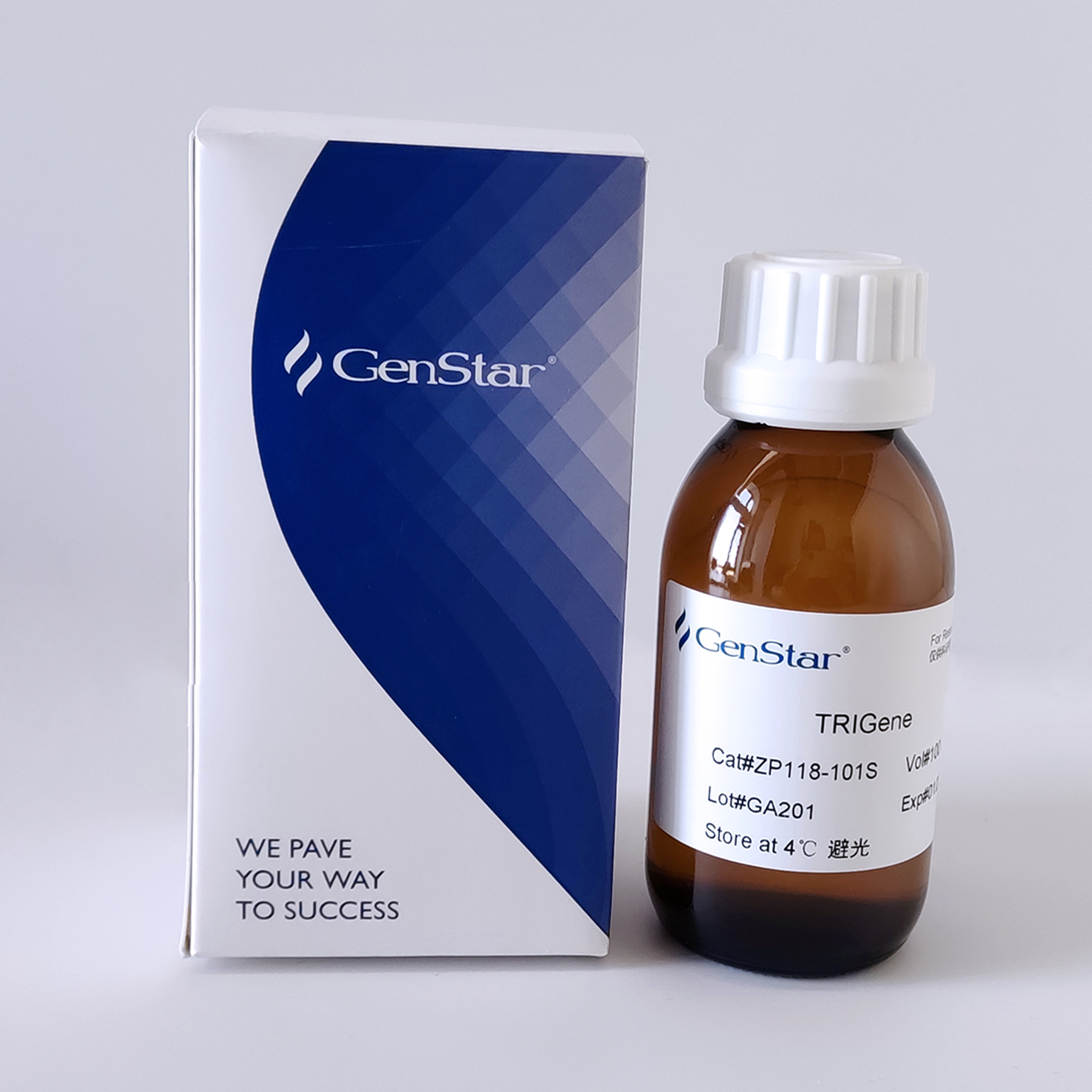 TRIGene 是基于 TriZol 原理制備的一種通用總 RNA 提取試劑。該方法簡(jiǎn)便、快捷,適用于動(dòng)植物細(xì)胞、組織、酵母細(xì)胞以及細(xì)菌的總 RNA 抽提。其原理是利用異硫氫酸胍/酚/氯仿法,快速裂解細(xì)胞,溶解細(xì)胞內(nèi)含物,抑制核酸酶活性,從而有效防止 RNA 在提取過(guò)程中的降解。加入氯仿后,溶液分為水相和有機(jī)相。RNA 保留在上層水相中,分離后可用異丙醇沉淀回收。TRIGene 提取的總 RNA 產(chǎn)量大、純度高,無(wú)基因組 DNA 和蛋白質(zhì)污染,可直接用于 RT-PCR、Northern blot、dot blot、polyA 篩選、體外翻譯、RNase 保護(hù)實(shí)驗(yàn)和分子克隆等一系列操作。