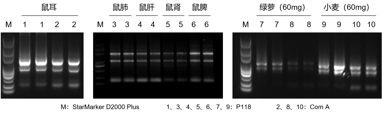 采用 GenStar #P118 提取小鼠不同部位組織、植物樣本綠蘿、小麥 RNA,進(jìn)行瓊脂糖凝膠電泳。結(jié)果顯示,GenStar #P118 適用于動(dòng)植物細(xì)胞、組織、酵母細(xì)胞、細(xì)菌等多種樣本的總 RNA 提取,且提取效果優(yōu)于 Com A。