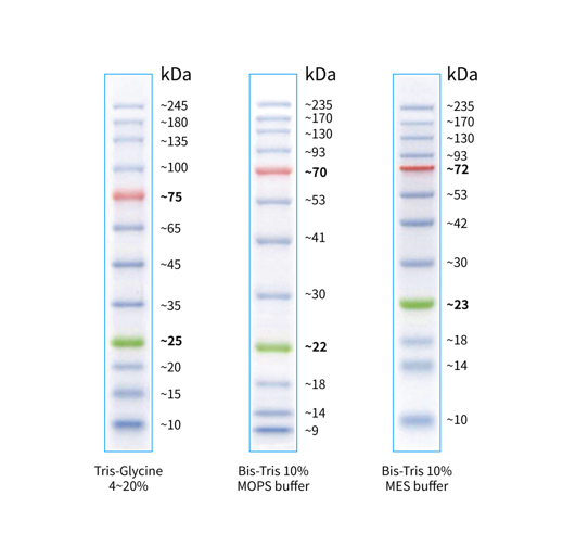 本產(chǎn)品由跨度從 10-245 kDa 的 12 種高度純化預染的重組蛋白質(zhì)組成,各條帶濃度約為 0.1-0.4 mg/ml。其中 25 kDa 條帶為綠色預染條帶,75 kDa 條帶為紅色預染條帶,方便判斷各個條帶的準確位置。本產(chǎn)品適合作為 SDS-PAGE 電泳時,變性蛋白樣品的分子量參照,并可實時觀察蛋白樣品的電泳分離狀況,也可用于檢測 Western blot 的轉(zhuǎn)膜效率。由于共價結(jié)合的染料會影響蛋白質(zhì)分子的電泳遷移率,本產(chǎn)品僅適于粗略地估計目的蛋白樣品的分子量。
