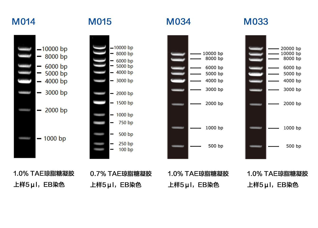 本產(chǎn)品為預(yù)混有 1x 上樣緩沖液的即用型 DNA 分子量標(biāo)準(zhǔn),由 13 條線狀雙鏈 DNA 條帶組成,適用于對 100 bp 至 10 kb 的雙鏈 DNA 分子大小的估算和粗略定量。本產(chǎn)品的 13 條帶分別為 100,250,500,750,1000,1500,2000,3000,4000,5000,6000,8000 和 10000 bp。其中 1500 bp、750 bp 條帶濃度最大,為 20 ng/µl,其余條帶濃度約為 10 ng/µl。