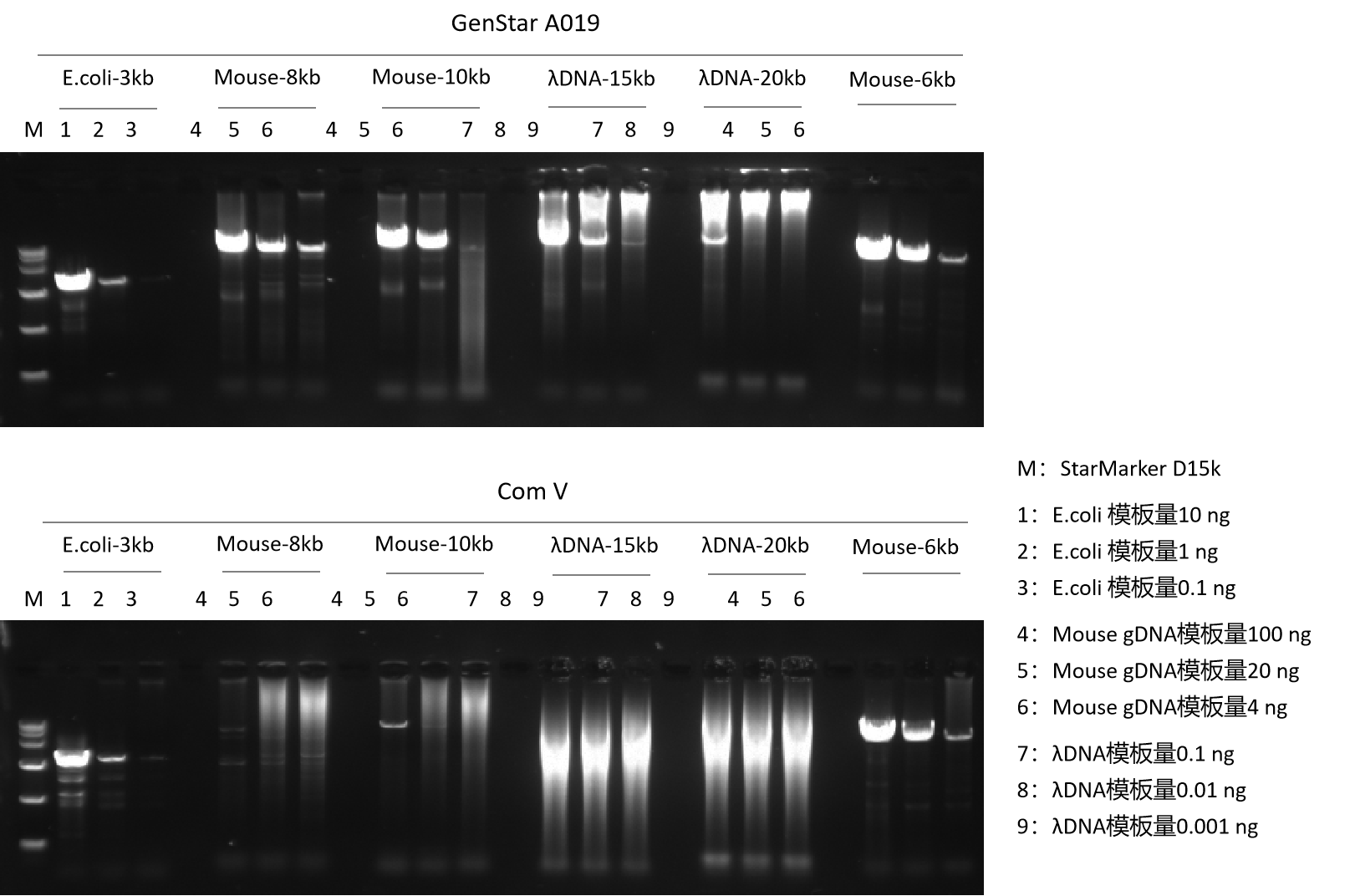 以 E.coli gDNA、Mouse gDNA、λDNA 為模板,使用 A019 和 Com V 進(jìn)行不同長(zhǎng)度片段的擴(kuò)增。結(jié)果顯示,A019 對(duì)不同種屬來(lái)源的長(zhǎng)片段擴(kuò)增能力強(qiáng),且優(yōu)于 Com V