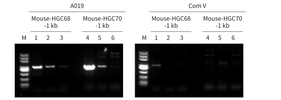 以 Mouse gDNA 為模板,使用 A019 和 Com V 進(jìn)行高 GC 片段的擴(kuò)增。結(jié)果顯示,A019 對(duì)高 GC 片段的擴(kuò)增能力強(qiáng),且優(yōu)于 Com V