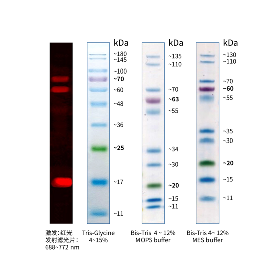 本產(chǎn)品由跨度從 11-180 kDa 的 10 種高度純化預染的重組蛋白質組成。10 種條帶分別為:11、17、25、36、48、60、70、100、145、180 kDa。其中 25 kDa 條帶為綠色預染條帶,70 kDa 條帶為紫色預染條帶,17、60、70 kDa 三個條帶可用于紅色波長(635 nm 激光或紅色 LED )的熒光印跡檢測,方便判斷各個條帶準確位置。