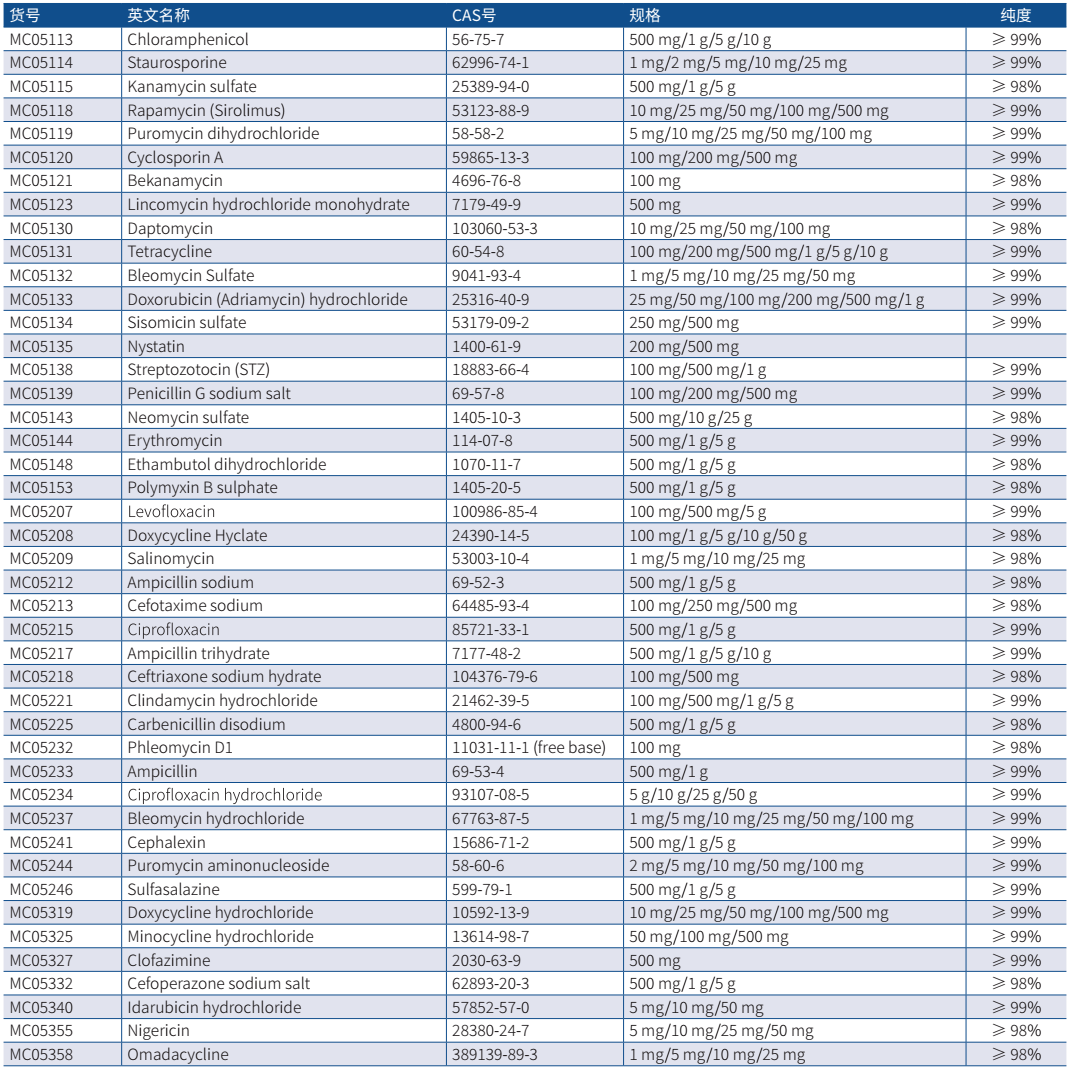 抗生素,主要是由細(xì)菌、霉菌或其他微生物產(chǎn)生的次級代謝產(chǎn)物或人工合成的類似物。通??梢岳斫鉃槟軌驓⑺兰?xì)菌或抑制其生長的試劑,主要用于治療各種細(xì)菌感染或致病微生物感染類疾病,一般情況下對其宿主不會產(chǎn)生嚴(yán)重的副作用。GenStar 目前可提供多種抗生素用于科學(xué)研究,充分滿足您的實(shí)驗(yàn)需求,為您的實(shí)驗(yàn)保駕護(hù)航。