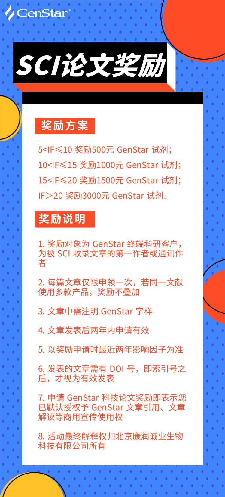 GenStar 自成立以來,一直深耕于分子生物學(xué)領(lǐng)域上游核心原料及配套體系的研發(fā),服務(wù)了全國數(shù)千家實驗室的科研人員。使用 GenStar 產(chǎn)品的 SCI 論文總數(shù)已達千余篇,其中包含《Nature》、《Science》、《Cell》等高水平的學(xué)術(shù)期刊。為了感謝廣大客戶的支持與信任,GenStar 繼續(xù)推行發(fā)表科技論文獎勵機,使用 GenStar 產(chǎn)品發(fā)表科技論文的人員均可申請。希望更多新老客戶參與其中,期待和您一起分享成功的喜悅。