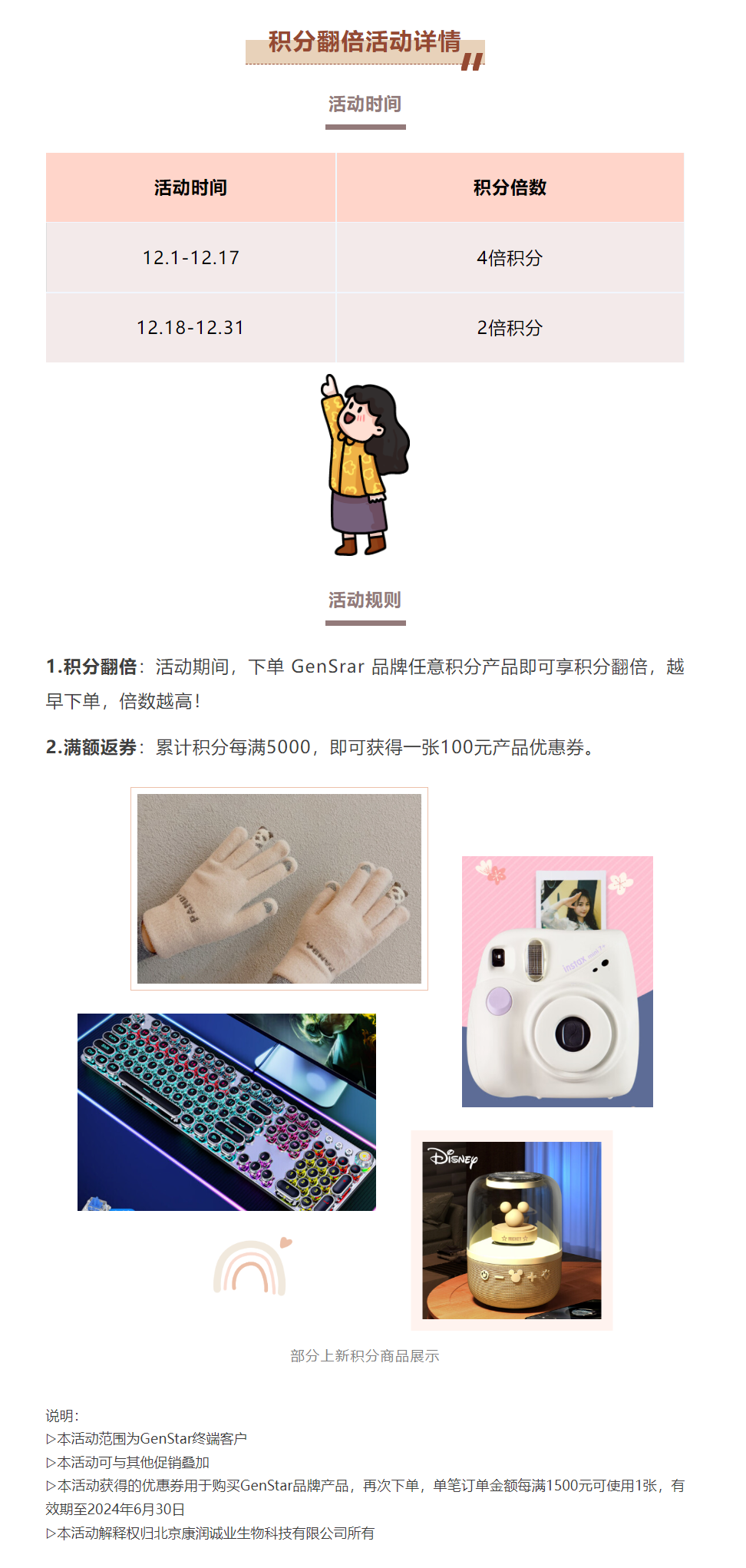 同時(shí),12.1-12.31 下單 GenStar 品牌產(chǎn)品,還有積分翻倍加持,越早下單,翻倍越高,最高可獲得 4 倍積分哦。積分商城商品持續(xù)上新中......快來(lái)下單領(lǐng)取積分,兌換您的心水好物吧~